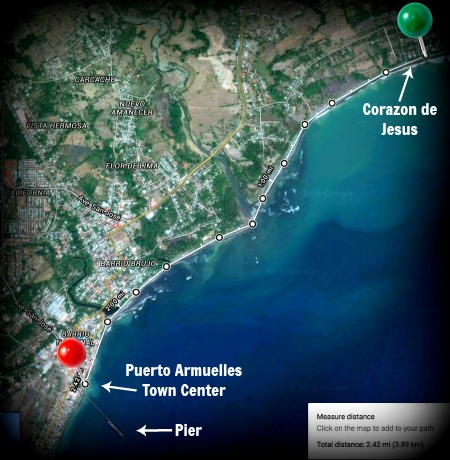 According to Google, it is 2.42 miles from the Corazon de Jesus neighborhood to downtown Puerto Armuelles.